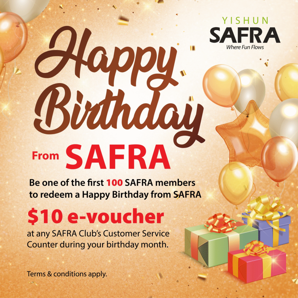 SAFRA’s refreshed birthday campaign is one of the more interesting local perks for members. From 1 April 2026 onward, SAFRA says eligible members can redeem a S$10 e-voucher during their birthday month at their chosen club’s customer service counter, with the voucher then usable at participating vendors and selected facilities in that club. There is a minimum spend requirement when the e-voucher is used, and the redemption is in person.