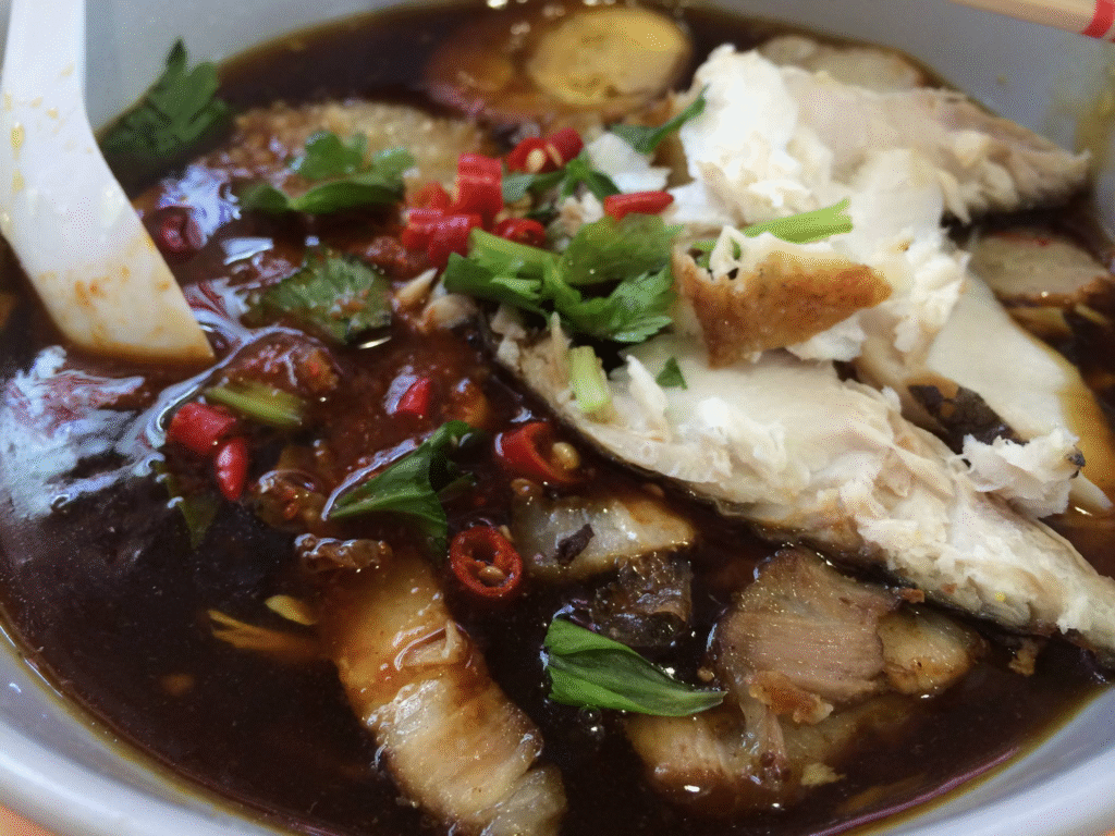 The bowl here is generous. You get everything, pork belly, meatballs, fish, egg, all sitting in a thick, slightly herbal gravy. It’s rich, bordering on indulgent, and definitely not a light meal.