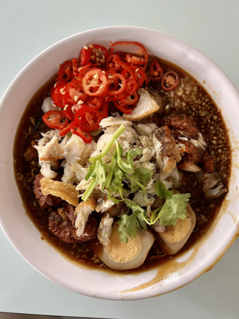 In Singapore, lor mee has evolved into its own identity. It traces its roots to Fujian-style noodles, but here, it’s become heavier, richer, more indulgent. The gravy is thicker, often starchy and deeply flavoured, and the toppings range from braised pork belly to crispy fish, meatballs, and ngoh hiang.